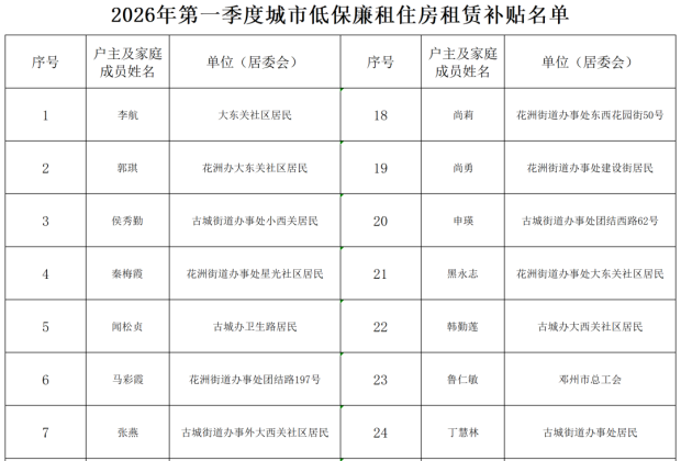 25户!邓州市第一季度廉租住房租赁补贴名单