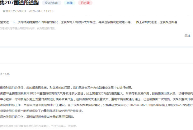 2026-04-07有网友求助: 麻烦各位领导有空关注一下,从构林到魏集段207国道的路况,这